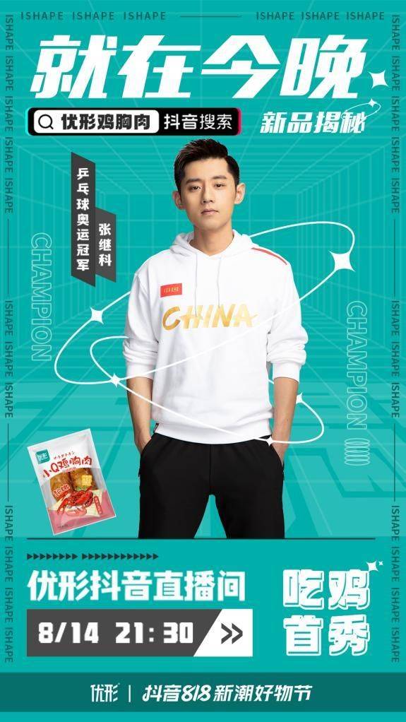 除晚会现场的高频曝光外,优形还高度关注直播人气。8月14日,优形特邀中国乒乓球史上最短时间内取得“大满贯”成就的运动员——张继科莅临直播间,推广当日于天猫、抖音双平台同步上市的新品—— “小Q鸡胸肉”。直播当晚,优形销量直接飙到近期峰值。显然,借助张继科与粉丝的高粘性互动,优形演绎了独特的“新潮好物”并广为公众接受。