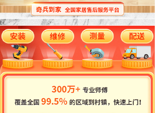 在这样的背景下,奇兵到家为家居商家提供了一站式售后解决方案。奇兵到家拥有300万+专业师傅资源,覆盖全国99.5%的区域至村镇。无论是家具、卫浴、灯具、锁具、窗帘等任何家居品类的安装、维修、测量或配送等需求,商家都能在奇兵到家平台上迅速找到最合适的师傅,极大地缩短了售后响应时间,有效减少了因售后不及时引发的消费者不满和退款纠纷,为家居商家提供了强有力的售后支持。