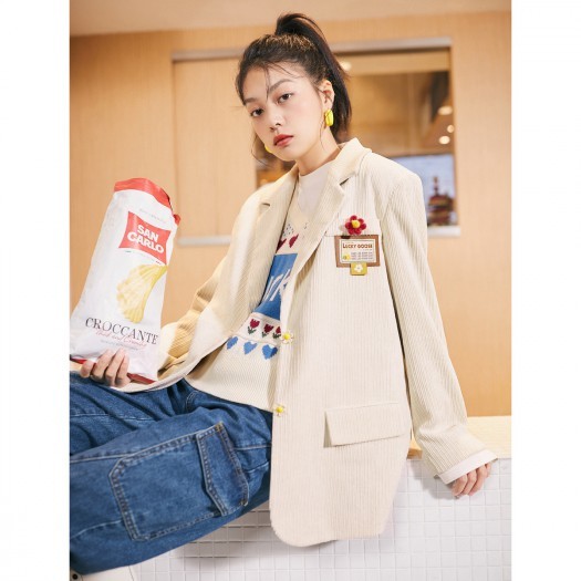 除了成套穿亮色系,乔夕辰平时还很喜欢一些中性色西装!这种色系的西装就一个词:百搭!很容易就能穿出不同风格。像乐町的这件玩趣贴标西装外套,在混搭印花卡通t恤的时候,休闲效果和减龄效果肉眼可见,像这种不费力的休闲路线,日常且百搭,强烈建议姑娘们借鉴!作为一枚经常要出去跑业务的打工的人,这种宽松版型的西装外套同时具备休闲单品的属性,再加上阔腿牛仔裤,基本诠释了什么叫怎么舒服怎么来。